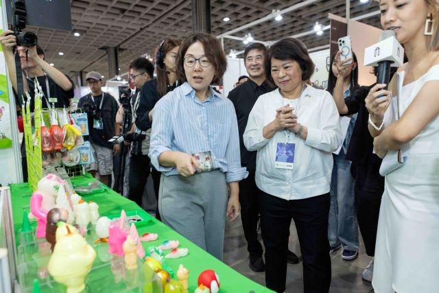 ▲文化部次長王時思(左1)、嘉義市長黃敏惠(左2),一同參與2025臺灣文博會品牌商展區IP導覽。