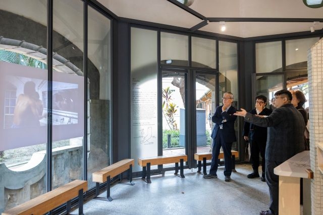 ▲導演曹瑞原在拍攝1970年代台北新公園男同志群體的故事時,選擇鐵道部園區的八角樓廁所作為場景,文化部長李遠(左1)參觀展區內播映的〈孽子〉片段。