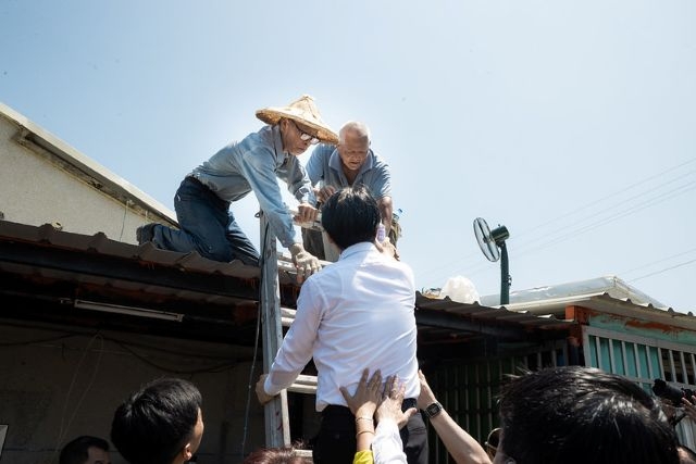 總統首先抵達七股區南聖宮,聽取環境部資源循環署賴瑩瑩署長說明石綿瓦屋頂清運情形,以及國家通訊傳播委員會陳崇樹代理主委說明通訊修復狀況,隨後現地視察並與現場鄉親互動表達誠摯關心。