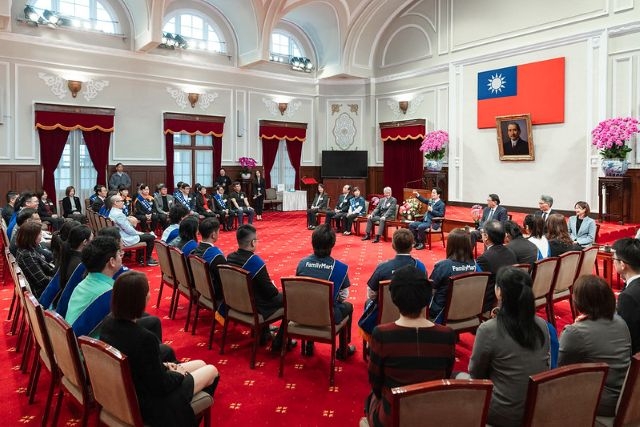 訪賓一行由台灣連鎖暨加盟協會理事長蔡德忠率領,經濟部次長賴建信陪同,前來總統府晉見總統,總統府秘書長潘孟安也在座。