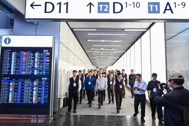 卓院長在交通部陳世凱部長及桃園國際機場公司楊偉甫董事長陪同下,首先視察桃園機場北登機廊廳工程概況。第三航廈建設分為3階段,北登機廊廳預計2025年底前啟用,主體航廈與南登機廊廳預計2027年底前陸續完工及營運測試,「桃園機場走過將近50年,在第二航廈啟用後,終於要再有新航廈」。而今日視察的北登機廊廳工程,設計強調開放與機能兼備的候機空間,出境旅客自報到至登機過程中毋須轉換樓層,簡化搭機流程。未來啟用後,將增加8個靠橋停機位,其中2個可容納1架大型廣體客機或2架窄體客機同時停靠,使機坪調度更具彈性,有效提升航班運作效率;另在盥洗空間方面,亦配有無障礙廁所,滿足不同旅客需求。