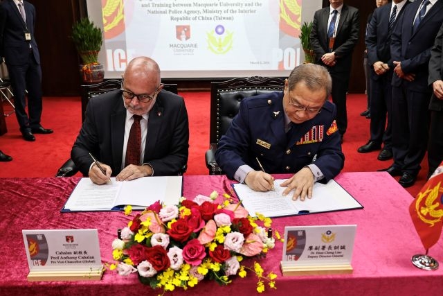 (合傳媒) 為厚植我國警政人才之國際競爭力,並深化與國際刑事司法學術機構之合作,警政署與澳洲麥考瑞大學(Macquarie University)於昨日上午11時舉辦教育訓練合作備忘錄簽署儀式,由副署長廖訓誠與該校全球事務副校長Anthony Cahalan代表簽署。簽署儀式除警政署相關單位主管外,更有澳洲辦事處官員蒞臨觀禮,一同見證警政署推動國際警察教育合作之新里程碑,以及臺澳在執法學術領域合作之重大進展。