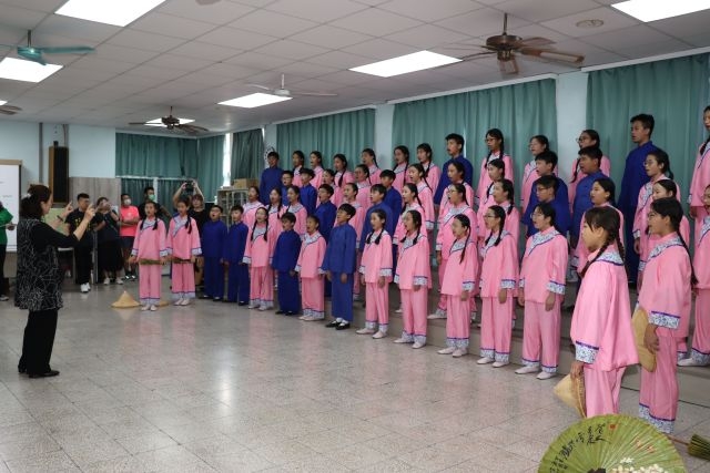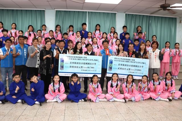 建國國小合唱團當場演唱日文歌曲「飯糰歌」、客語「客家世界」2首參典歌曲,縣長夫人陳美琦頒贈合唱團4萬700元獎勵金,頭份市長羅雪珠亦頒贈2萬5千元獎勵金,此外,縣長夫人亦致贈每位團員文具禮品及肉包點心,期勉合唱團持續發光發熱,讓世界聽見來自苗栗的歌聲。