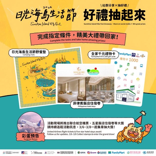 隨著日光海島生活節即將登場,抽獎活動同步開跑。民眾只要關注市府官方社群並分享活動貼文,即有機會獲得限量日光海島生活節紀念品、全家禮品卡及菲律賓星級飯店住宿券;活動期間參與集章活動,更有機會抽中聯合航空「高雄-東京」及「台北-關島」來回機票等大獎。