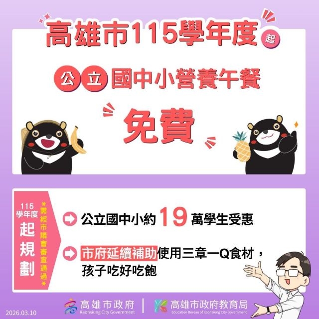 市政會議今日通過追加預算案及墊付款案送議會審議,追加預算案主要包含三大重點,首先,照顧高雄孩子,減輕家長負擔。公立國中小營養午餐全面免費,嘉惠全市約19萬名學生,讓每位孩子都能安心吃好、吃飽,追加預算約11億餘元。