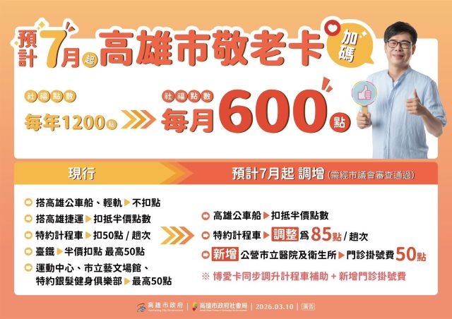 第二,敬老卡點數大幅增加為每月600點,讓高雄長者生活交通更便利,自今年七月起,高雄市敬老卡從長輩每年1200點額度,加碼每月600點,追加預算約1.6億餘元,不僅點數增加,使用範圍也擴大至公營市立醫院及衛生所門診掛號費,特約計程車調高每趟次可扣85點,全面照顧長輩生活。