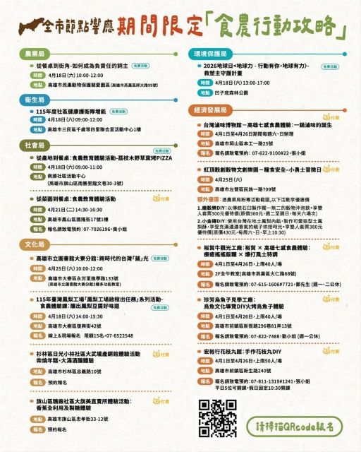 除主展場展示外,「高雄永續食農生活節」亦串聯各局處,規劃多場系列活動,包含文化社造據點、經濟發展局輔導的觀光工廠、環境保護局「2026地球日<地球力-行動有你,地球有力>-救塑主守護計畫」、客家事務委員會「慢食客庄X療癒食農X永續生活X七感體驗」、衛生局「115年度社區健康護衛隊增能」、社會局「荔枝木野草窯烤PIZZA」、農業局神農市集「農民老師親子食農體驗」和「鹽埕第一公有市場走讀」等,透過「論壇沙龍」、「市場導覽」、「食農體驗」等多元形式,引導市民實踐食農行動。