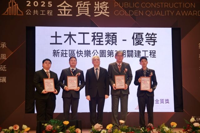 在公共工程品質優良獎,城鄉局「三峽國光段(二期)青年社會住宅新建統包工程」結合綠建築、智慧系統與公益設施,拿下建築類工程特優;土木類工程則是新工處「新莊快樂公園第3期闢建工程」,以全齡共融、防災與生態設計獲得優等肯定。