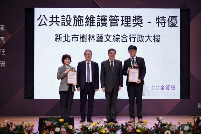 新工處「新北市樹林藝文綜合行政大樓」以導入智慧維護與數位管理模式,榮獲公共設施維護管理獎特優。個人貢獻獎部分,由捷運工程局涂貫迪主任秘書、養護工程處黃裕智副總工程司及工班職人蕭柏輝榮獲優等。
