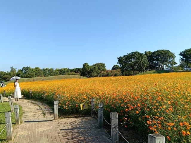 陳局長提到,黃波斯菊花期集中於十月上旬至中旬,盛開時滿園金黃燦爛,如同一片流動的花之海洋;搭配園內逐漸轉色的落羽松林,由綠轉黃再轉橘紅的層次變化,讓秋日景致更顯浪漫多樣,成為攝影愛好者與散步民眾的熱門取景地。許多民眾紛紛在網路上分享實景照與心得,驚呼「兩個星期前還只是綠葉嫩芽,現在居然全爆開了!」、「提前感受初秋的美!」,花海美景迅速在社群間口耳相傳,吸引遊客爭相前往朝聖。