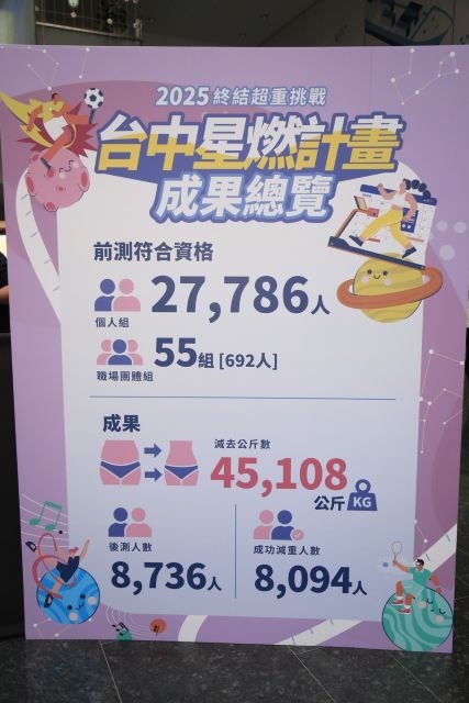(合傳媒) 台中市政府衛生局今(5)日舉辦「2025台中星燃計畫:終結超重挑戰」成果表揚記者會,宣布為期三個月的大型健康競賽圓滿落幕。市長盧秀燕出席嘉勉表示,星燃計畫源自她看見許多市民努力減肥卻常覺得孤單,因此市府推出專業陪伴與科學方法,邀請大家一起變健康。活動共吸引27,786人報名,等於每100位市民就有1位響應,最終超過8,000人成功達標,累計甩肉4.5萬公斤,展現市民追求健康的驚人行動力。